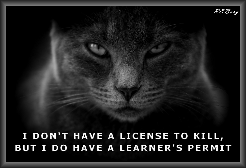 Anticipated Action Image May 28, 2023January 8, 2024 R.E. Berg Companion Critters, Deadly Living, humor, joke, meme, Social Hostilitycat, learner's permit, license to kill Share this: Click to share on X (Opens in new window) X Click to share on Facebook (Opens in new window) Facebook Like Loading... Related