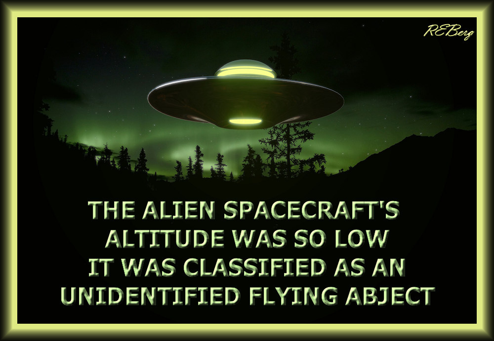 A New Low Image June 29, 2023 R.E. Berg humor, Imaginary Reality, joke, meme, Punishingly Punny Too, Scientific Sensibilityabject, alien, atltitude, flying saucer, object, spacecraft, UFA, UFO Share this: Click to share on X (Opens in new window) X Click to share on Facebook (Opens in new window) Facebook Like Loading... Related
