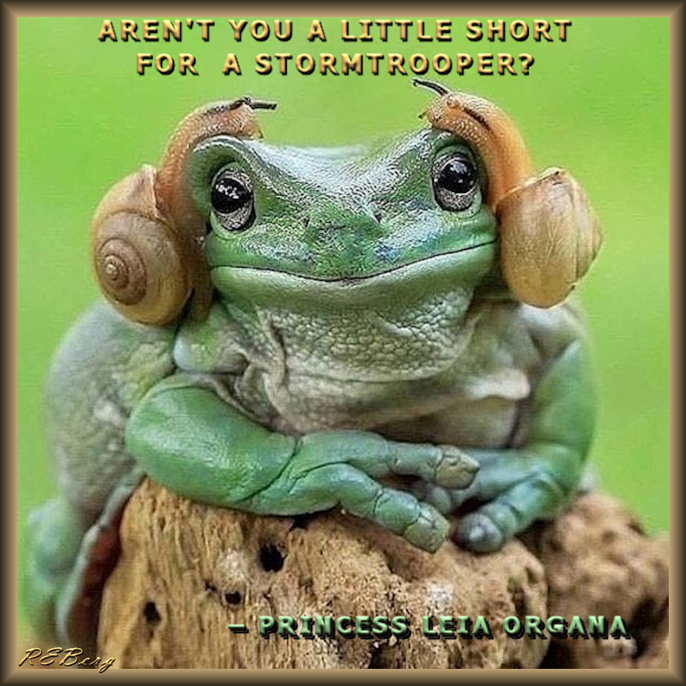 Questionable Rescue Image July 6, 2023 R.E. Berg Fabulous Fashion, humor, joke, Marginal Entertainment, meme, Occupational Oddities, Quote Quotientfrog, hairdo, Princess Leia, side buns, snails, Star Wars, Stormtrooper Share this: Click to share on X (Opens in new window) X Click to share on Facebook (Opens in new window) Facebook Like Loading... Related