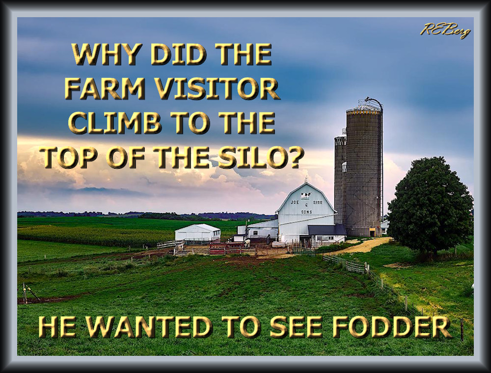 Field Of View Image July 17, 2023 R.E. Berg Agricultural Acumen, humor, joke, meme, Punishingly Punnyclimb, farm, farther, fodder, silo, top, visitor Share this: Click to share on X (Opens in new window) X Click to share on Facebook (Opens in new window) Facebook Like Loading... Related