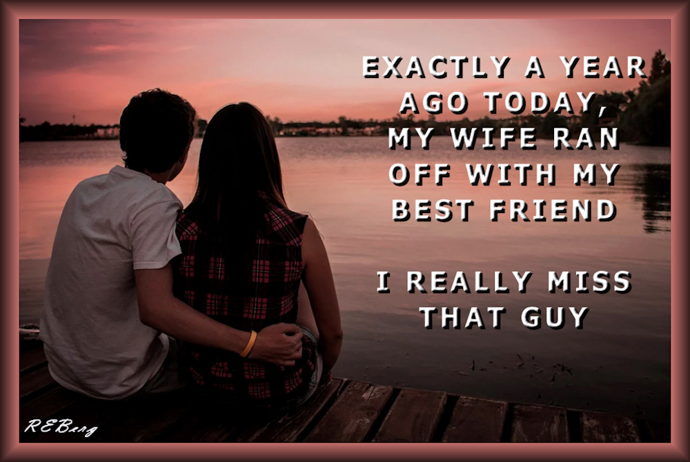 First Anniversary Image September 28, 2023 R.E. Berg humor, joke, meme, Rocky Relationships, Special Daysbest friend, miss him, ran off, wife, year ago Share this: Click to share on X (Opens in new window) X Click to share on Facebook (Opens in new window) Facebook Like Loading... Related