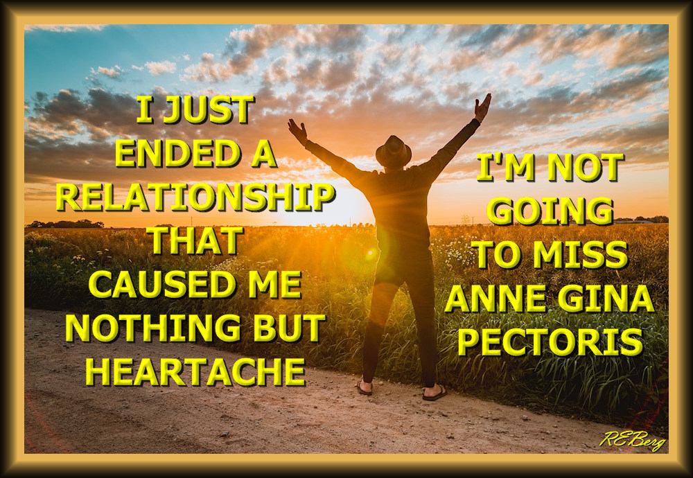 Pain Management Image October 9, 2023 R.E. Berg humor, joke, meme, Punishingly Punny Too, Rocky Relationshipsangina pectoris, Anne Gina Pectoris, caused, ended, going, heartache, miss, nothing, relationship Share this: Click to share on X (Opens in new window) X Click to share on Facebook (Opens in new window) Facebook Like Loading... Related