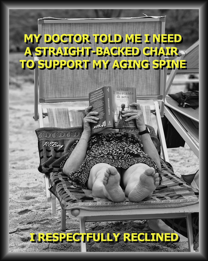 Preposterous Posture Image October 15, 2023October 15, 2023 R.E. Berg Age Management, humor, joke, meme, Punishingly Punny Tooaging, chair, declined, doctor, need, reclined, respectfully, spine, straight-backed, support, told Share this: Click to share on X (Opens in new window) X Click to share on Facebook (Opens in new window) Facebook Like Loading... Related