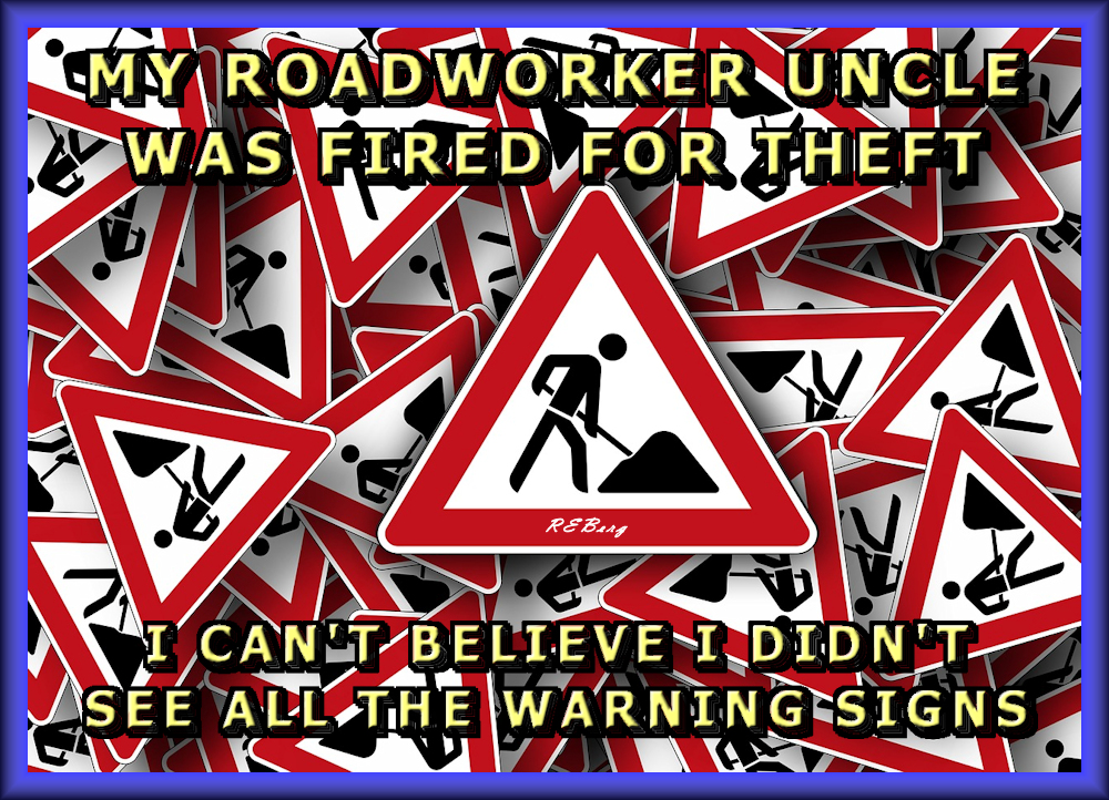 Attention Deficit Image October 25, 2023 R.E. Berg humor, Ill Legalities, joke, meme, Occupational Oddities, Punishingly Punnyfired, missed, roadworker, signs, theft, uncle, warning Share this: Click to share on X (Opens in new window) X Click to share on Facebook (Opens in new window) Facebook Like Loading... Related