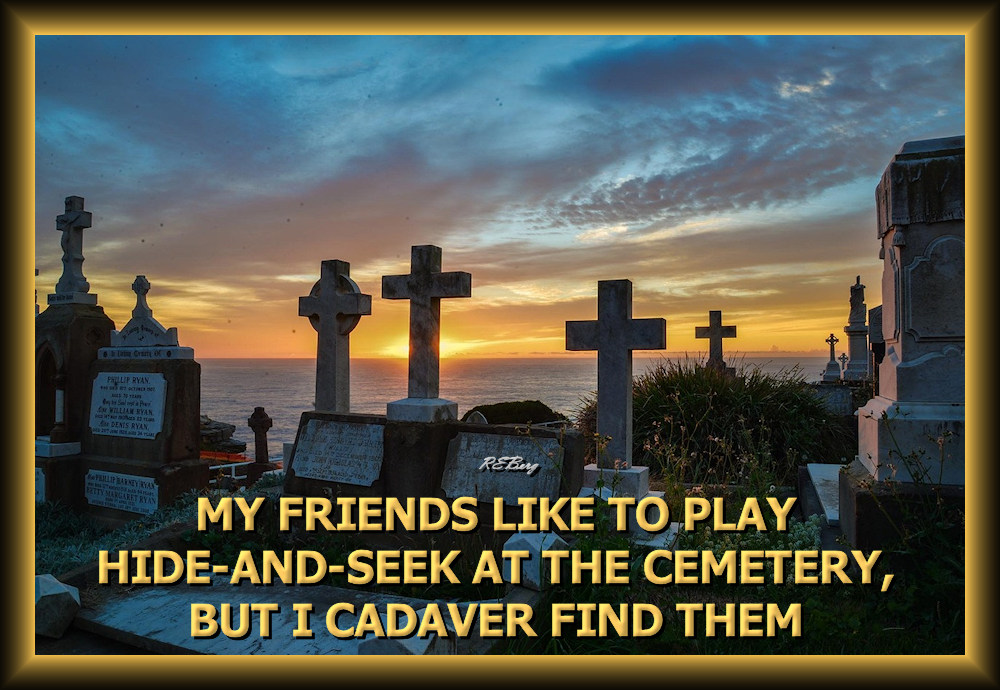 Ghostly Game Image October 29, 2023 R.E. Berg humor, Irrational Recreation, joke, meme, Punishingly Punny, Special Dayscadaver, can't, cemetery, ever, find, friends, hide-and-seek, play Share this: Click to share on X (Opens in new window) X Click to share on Facebook (Opens in new window) Facebook Like Loading... Related