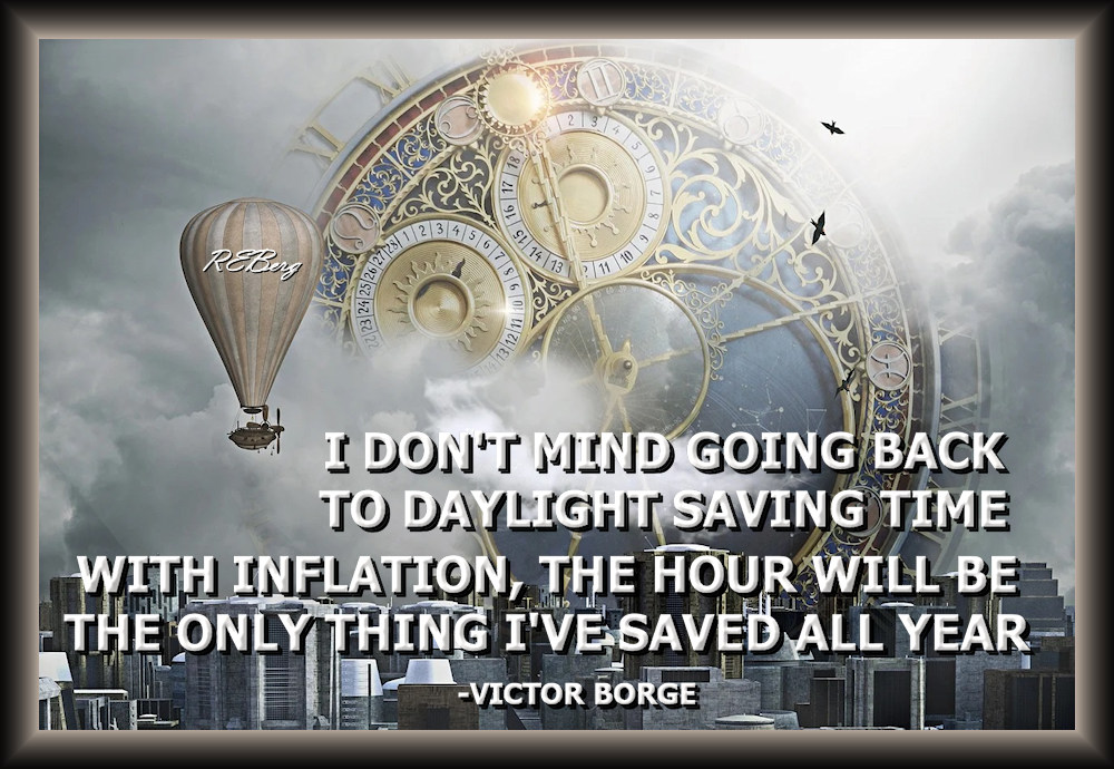 Temporal Banking Image March 9, 2024March 9, 2024 R.E. Berg Fanciful Finances, humor, Imaginary Reality, joke, meme, Mental Gymnastics, Punishingly Punny Too, Quote Quotient, Random Observations, Special Daysdaylight, hour, inflation, save, saving, thing, time, Victor Borge, year Share this: Click to share on X (Opens in new window) X Click to share on Facebook (Opens in new window) Facebook Like Loading... Related