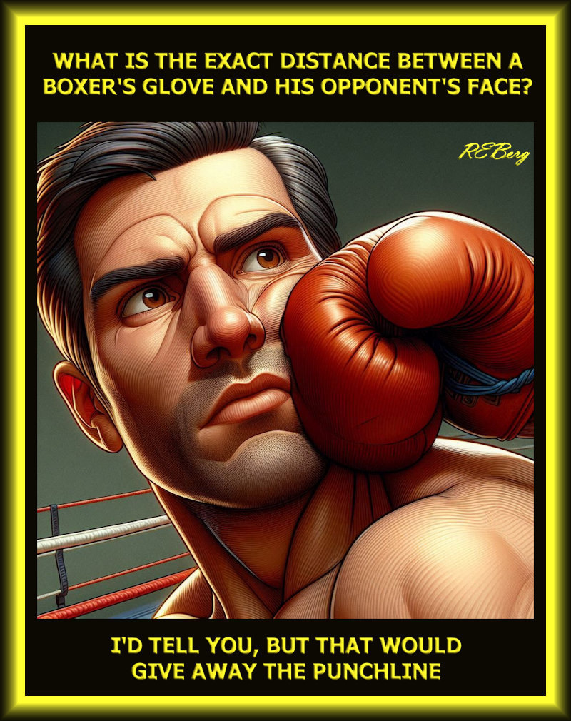 Deadly Living, humor, Irrational Recreation, joke, Lively Dying, Locational Logic, Marginal Entertainment, meme, Mental Gymnastics, Occupational Oddities, Punishingly Punny Too, Random Observations, Rocky Relationships, Social Hostilityboxer's glove, exact distance, give away, opponent's face, punchline, question, riddle, tell you