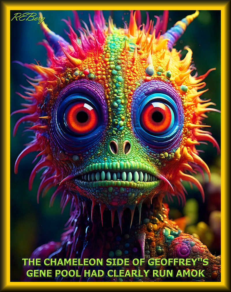 Colorful Character Image April 26, 2025 R.E. Berg humor, Imaginary Reality, joke, meme, Random Observations, Scientific Sensibilitychameleon, creature, gene pool, run amok, side Share this: Click to share on X (Opens in new window) X Click to share on Facebook (Opens in new window) Facebook Like Loading... Related