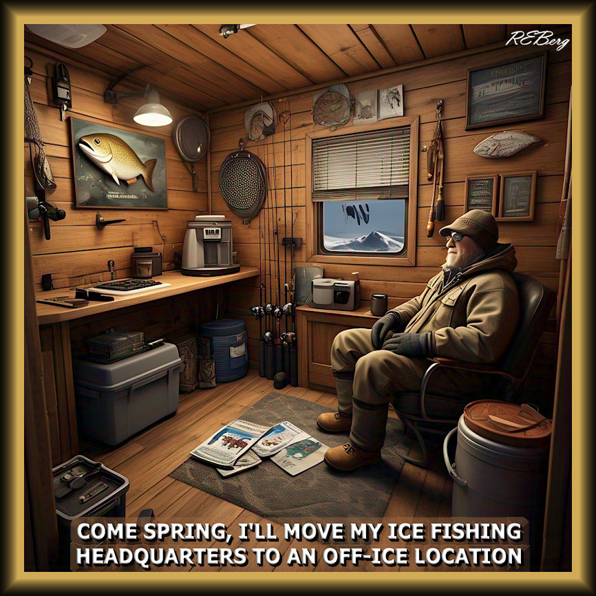Seasonal Situation January 15, 2026 R.E. Berg humor, Irrational Recreation, joke, Locational Logic, Marginal Entertainment, meme, Mental Gymnastics, Random Observationscome spring, comfortable, headquarters, ice fishing, ice shack, location, man, move, off-ice Share this: Share on X (Opens in new window) X Share on Facebook (Opens in new window) Facebook Like Loading... Related