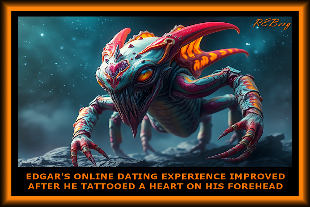 Monsters Only January 27, 2026 R.E. Berg Artful Articulations, humor, Imaginary Reality, joke, Marginal Entertainment, meme, Mental Gymnastics, Random Observations, Rocky Relationships, Social Hostilityafter, dating, experience, forehead, heart, improved, online, tattooed Share this: Share on X (Opens in new window) X Share on Facebook (Opens in new window) Facebook Like Loading... Related