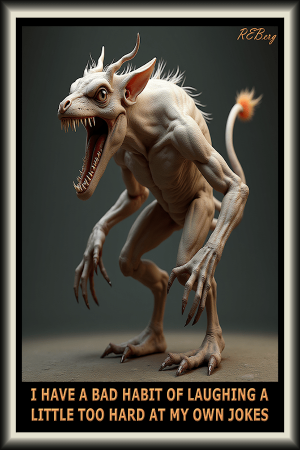 Self-Appreciation January 28, 2026 R.E. Berg humor, Imaginary Reality, joke, Marginal Entertainment, meme, Mental Gymnastics, Random Observations, Rocky Relationships, Social Hostilitya little too hard, bad habit, creature, laughing, own jokes Share this: Share on X (Opens in new window) X Share on Facebook (Opens in new window) Facebook Like Loading... Related