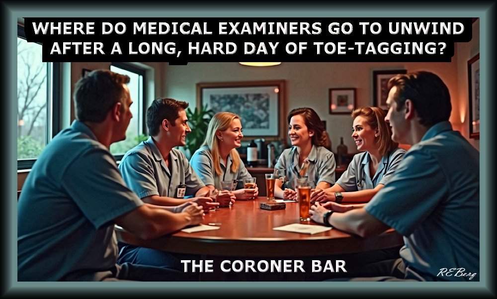 Lively Conversation February 4, 2026 R.E. Berg Deadly Living, humor, Imaginary Reality, joke, Lively Dying, meme, Mental Gymnastics, Occupational Oddities, Punishingly Punny, Random Observationsbar, corner, coroner, day, hard, long, medical examiners, morgue, toe-tagging, unwind, where Share this: Share on X (Opens in new window) X Share on Facebook (Opens in new window) Facebook Like Loading... Related