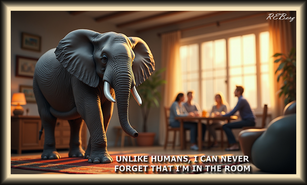 Always Remember Image February 20, 2026 R.E. Berg Companion Critters, humor, Imaginary Reality, joke, Locational Logic, Marginal Entertainment, meme, Mental Gymnastics, Random Observations, Rocky Relationshipscan never forget, elephant, Humans, in the room, unlike Share this: Share on X (Opens in new window) X Share on Facebook (Opens in new window) Facebook Like Loading... Related
