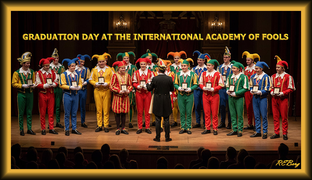 Best Of The Jest April 1, 2026 R.E. Berg Education Sensation, humor, Imaginary Reality, joke, Marginal Entertainment, meme, Occupational Oddities, Special DaysApril Fools' Day, ceremony, certificates, commencement, diplomas, graduation day, International Academy of Fools, presentation Share this: Share on X (Opens in new window) X Share on Facebook (Opens in new window) Facebook Like Loading... Related