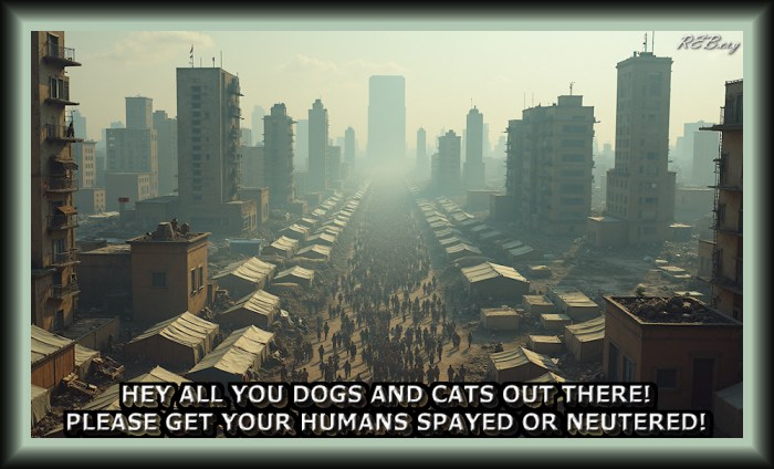 Pet Peeve April 7, 2026 R.E. Berg Companion Critters, Deadly Living, humor, Imaginary Reality, Improper Parenting, joke, meme, Random Observationsdogs and cats, get your humans, hey, homeless, neutered, out there, overpopulation, please, spayed Share this: Share on X (Opens in new window) X Share on Facebook (Opens in new window) Facebook Like Loading... Related