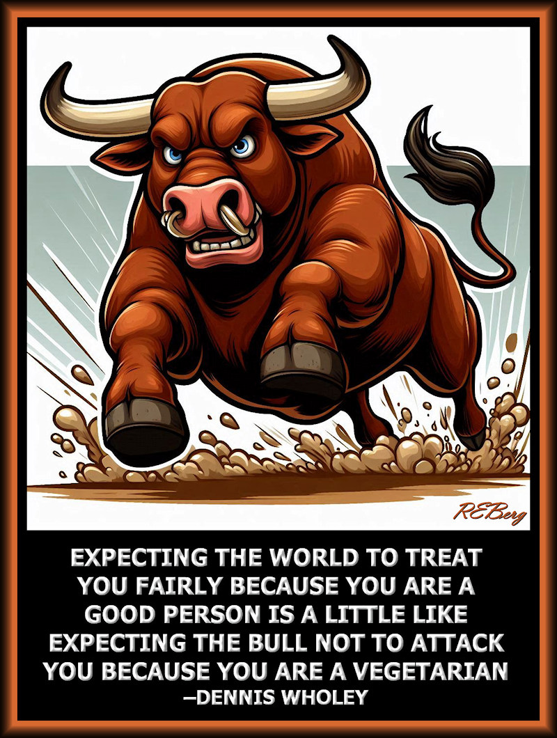Bully! Image April 23, 2025 R.E. Berg Agricultural Acumen, Fabulous Fashion, humor, Imaginary Reality, joke, Marginal Entertainment, meme, Punishingly Punny, Social Hostility angry, bull, Ferdinand, fit to be tied, minotaur, seeing red, suit