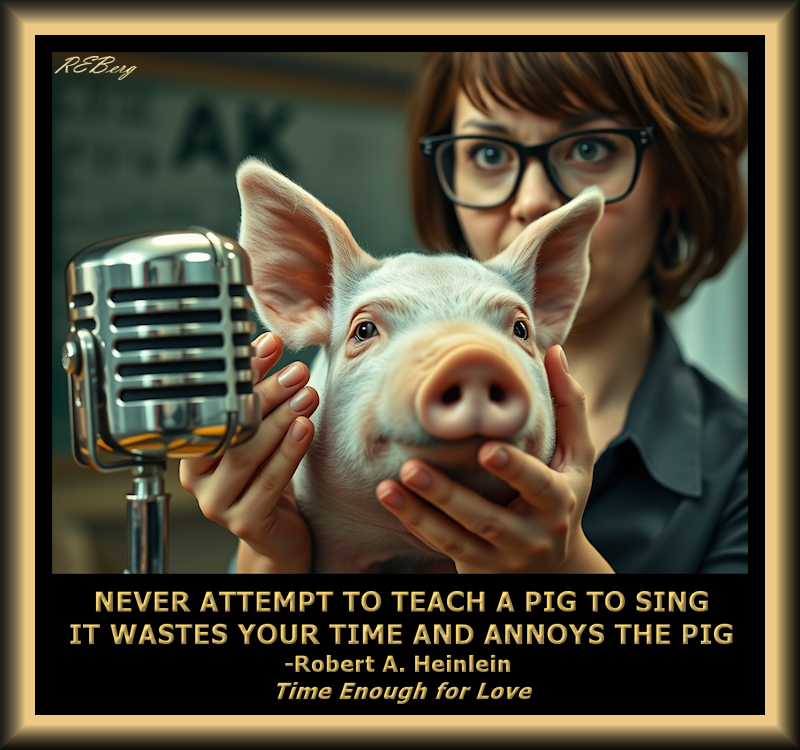 Superlative Songfest Image October 25, 2025 R.E. Berg Companion Critters, Education Sensation, humor, Imaginary Reality, joke, Marginal Entertainment, meme, Quote Quotient, Random Observations, Rocky Relationships annoys, attempt, never, pig, Robert A. Heinlein, teach, Time Enough for Love, to sing, wastes your time