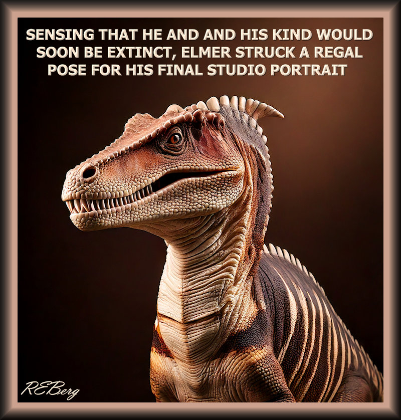 Grand Exit Image May 31, 2025May 31, 2025 R.E. Berg Deadly Living, Fabulous Fashion, humor, Imaginary Reality, joke, Lively Dying, meme, Mental Gymnastics, Scientific Sensibility dinosaur, extinct, final, his kind, portrait, pose, regal, sensing, studio