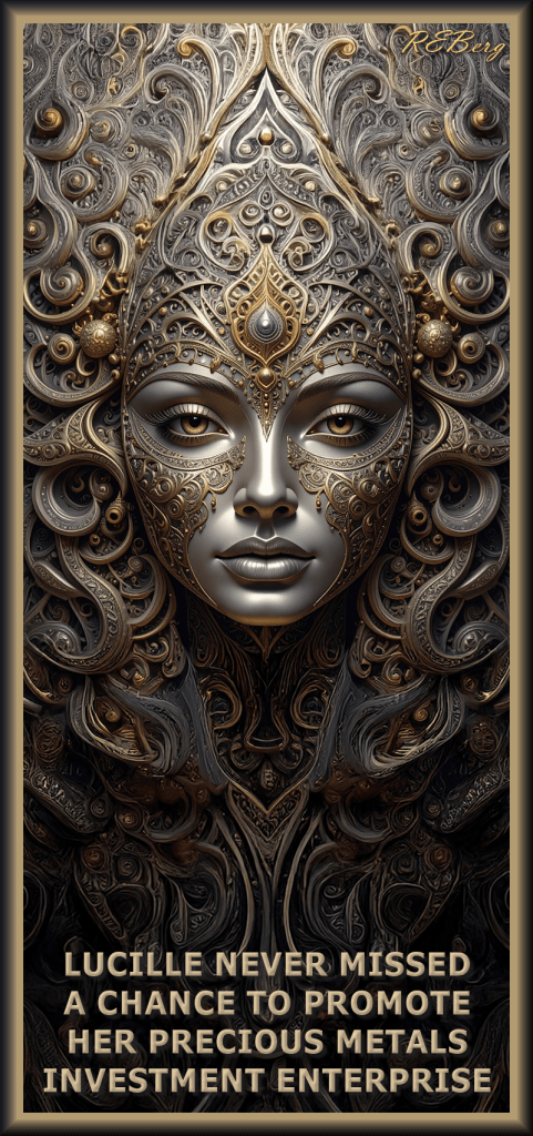 Polished Pitch Image July 22, 2025July 22, 2025 R.E. Berg Fabulous Fashion, Fanciful Finances, humor, joke, meme, Occupational Oddities, Random Observations bejeweled, chance, face, investment enterprise, never missed, opportunity, precious metals, promote, woman