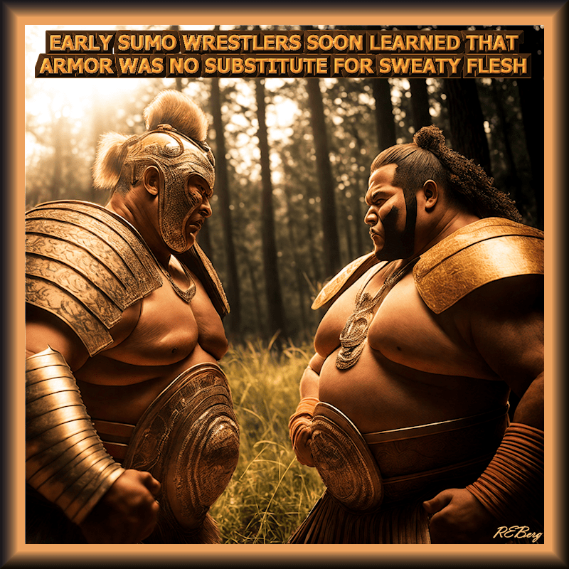 Protection Rejection Image July 23, 2025 R.E. Berg Education Sensation, Fabulous Fashion, humor, Imaginary Reality, Irrational Recreation, joke, Marginal Entertainment, meme, Occupational Oddities, Random Observations, Scientific Sensibility, Social Hostility armor, early, no substitute, soon learned, sumo, sweaty flesh, wrestlers