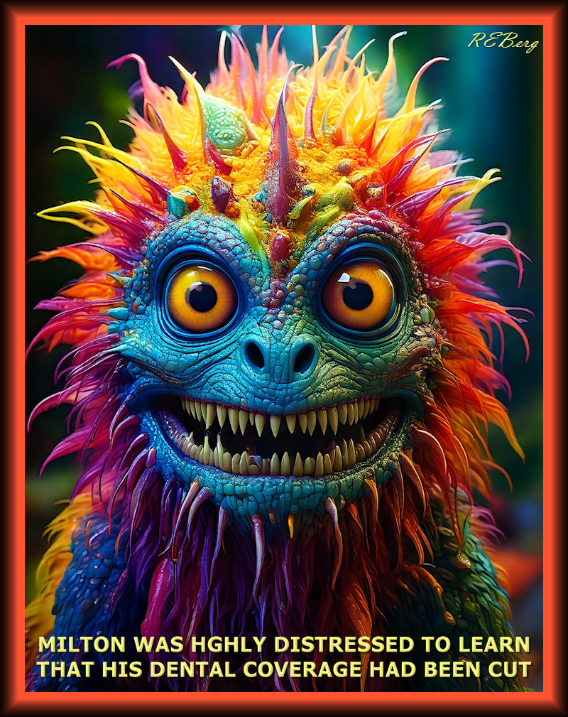 Smiling Setback January 9, 2026January 9, 2026 R.E. Berg humor, Ill Legalities, Imaginary Reality, joke, meme, Random Observations, That's Living cut, dental coverage, grimace, highly distressed, learn, lots of big teeth, monster, smile