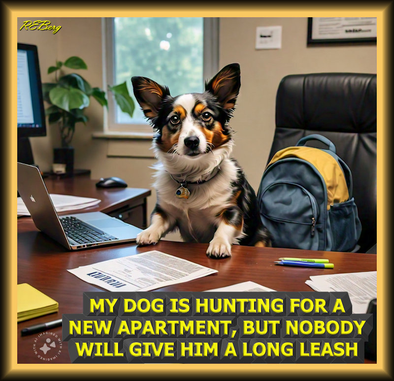 Looking Longterm Image January 20, 2025 R.E. Berg Companion Critters, humor, Ill Legalities, joke, Locational Logic, meme, Punishingly Punny, Rocky Relationships dog, give, hunting, lease, leash, long, new apartment, nobody