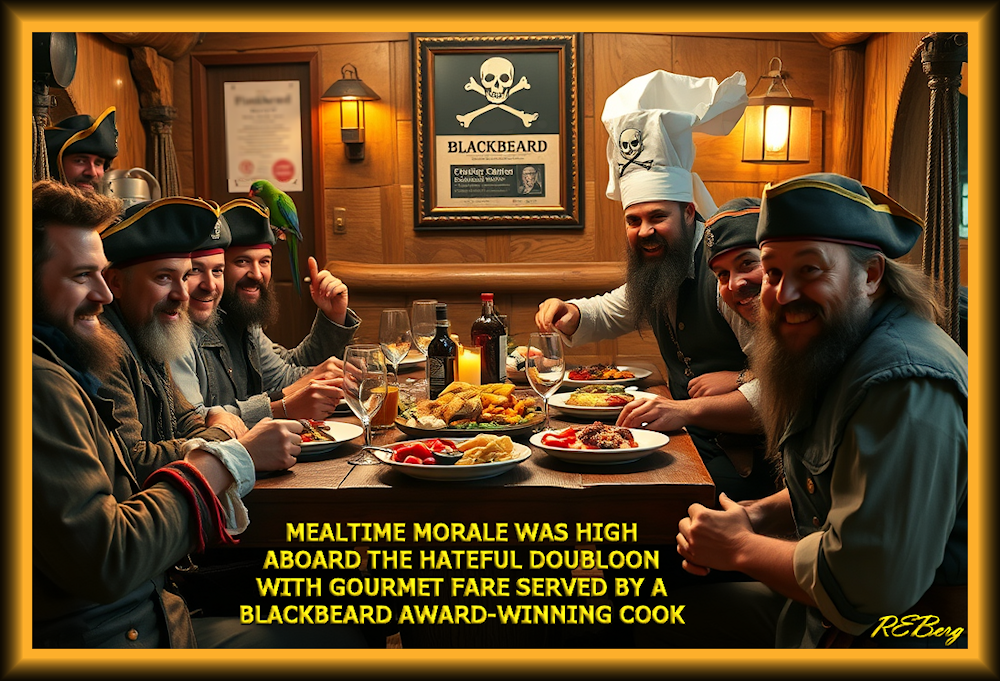 Buccaneer Banquet Image February 16, 2025 R.E. Berg Culinary Curiosities, Deadly Living, humor, Ill Legalities, joke, meme, Occupational Oddities, Punishingly Punny aboard, Beard Award, Blackbeard Award, certificate, chef, cook, galley, gourmet fare, high, mealtime, morale, pirates, serve, ship, winner