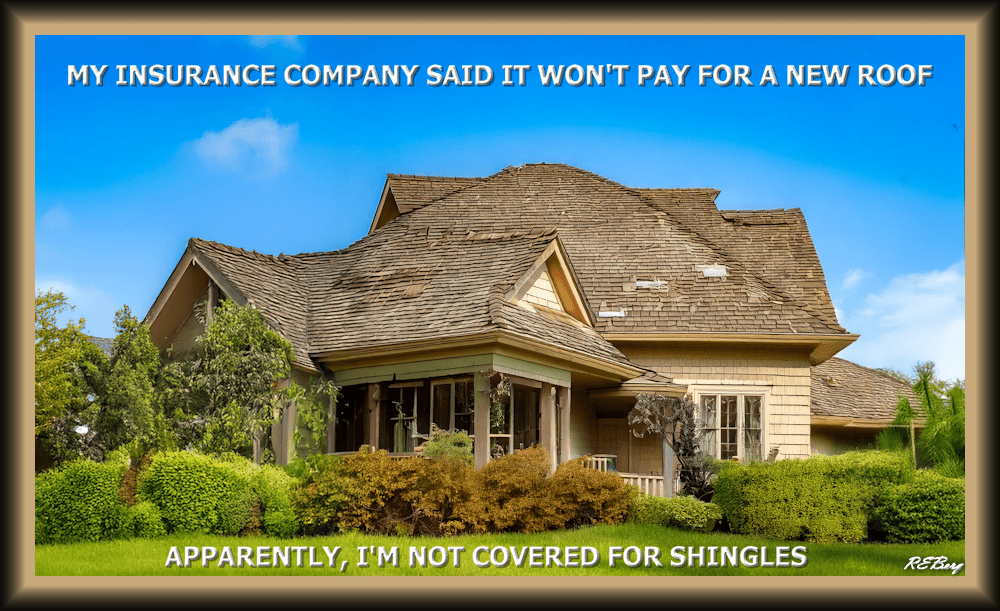Damage Control Image March 21, 2025 R.E. Berg humor, Ill Legalities, joke, meme, Punishingly Punny, Rocky Relationships, That's Living company, home, insurance, new roof, not covered, pay, shingles