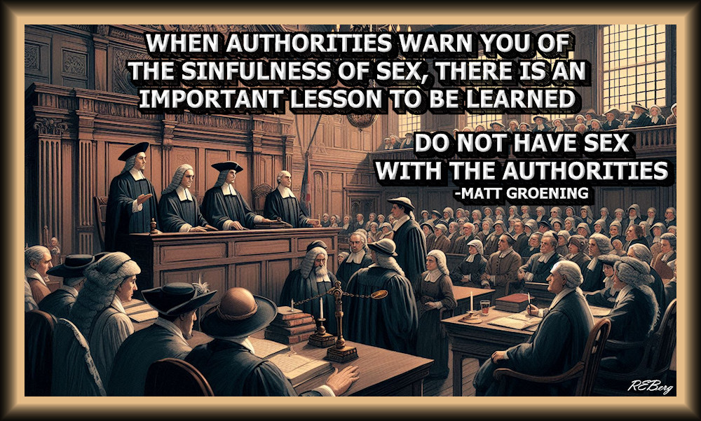 Pure Prudence Image March 11, 2025March 11, 2025 R.E. Berg humor, Ill Legalities, Imaginary Reality, joke, Marginal Entertainment, meme, Political Potpourri, Punishingly Punny Too, Quote Quotient, Random Observations, Rocky Relationships, Social Hostility authorities, courtroom, important lesson, learned, Matt Groening, Puritan, sinfulness of sex, trial, warn