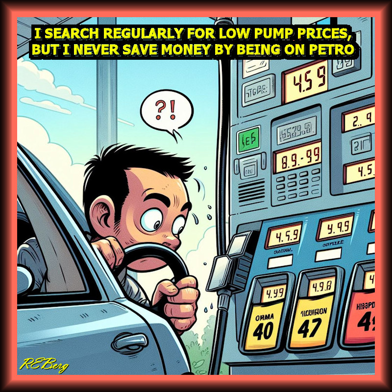 The Price Is Wrong Image May 26, 2024 R.E. Berg Fanciful Finances, humor, Ill Legalities, joke, meme, Punishingly Punny Too, Random Observations low, money, patrol, petro, prices, pump, regular, save, search