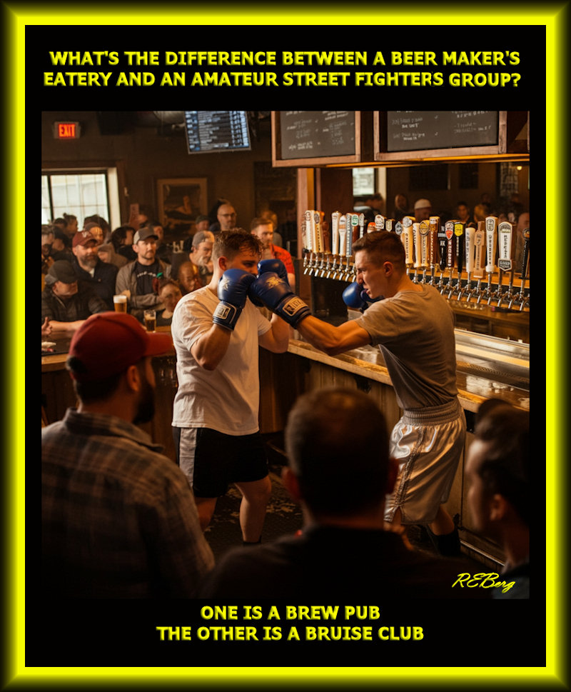 Boozing For A Bruising Image November 10, 2024November 10, 2024 R.E. Berg Culinary Curiosities, humor, Ill Legalities, Irrational Recreation, joke, Locational Logic, Marginal Entertainment, meme, Punishingly Punny, Random Observations, Rocky Relationships, Social Hostility amateur, beer, brew pub, bruise, club, difference, eatery, fighters, group, maker