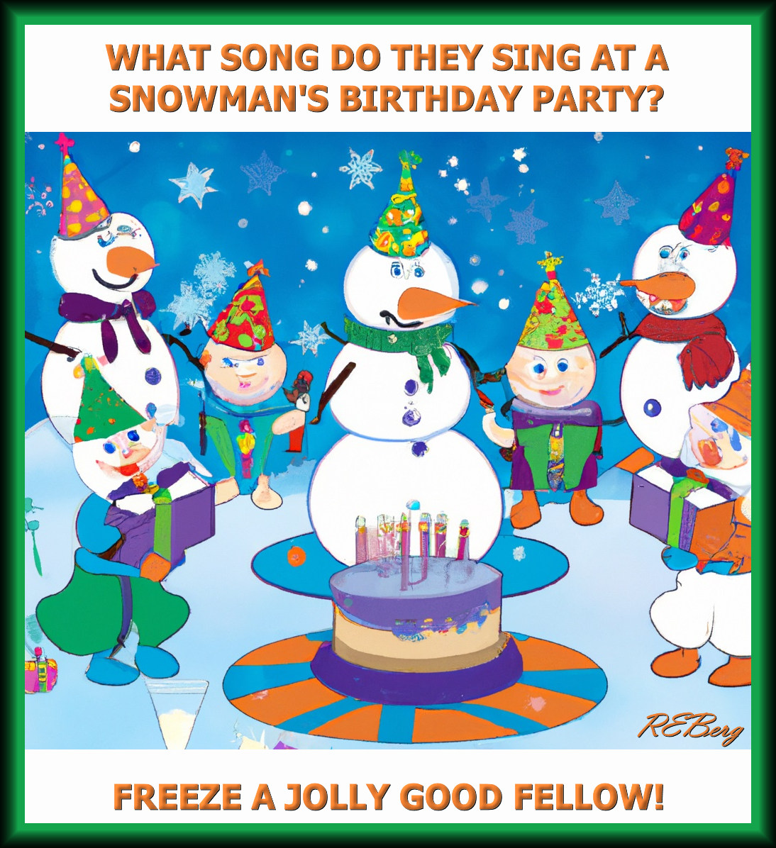 Cool Celebration Image January 5, 2025January 5, 2025 R.E. Berg humor, Imaginary Reality, joke, Marginal Entertainment, meme, Musical Mayhem, Punishingly Punny, Special Days birthday party, for he's, freeze, jolly good fellow, sing, snowman, song