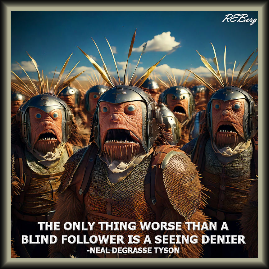 Mob Mindedness Image June 27, 2025 R.E. Berg Education Sensation, humor, joke, meme, Mental Gymnastics, Political Potpourri, Quote Quotient, Random Observations, Social Hostility blind follower, Neal Degrasse Tyson, only thing worse, primitive warriors, seeing denier