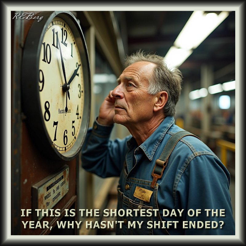 Still Waiting Image December 21, 2025 R.E. Berg humor, joke, Locational Logic, meme, Mental Gymnastics, Occupational Oddities, Random Observations, Scientific Sensibility, Special Days clock, end, shift, shortest day, winter soltice, worker, year