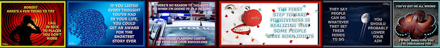 SOCIAL HOSTILITY Abbreviated Response Abridged Autobiography Abuser Advisory Academy Candidate Active Filter Active Misconception Actively Ambivalent Accommodation Crisis Actually Speaking Admonition Repetition Advanceable Agenda Advisory Diversion Agent Of Change Agricultural Expansion A.I. Yi-Yi! Alacrity Junkie Alien Advisory Alien Nation All About A Bout All Boxes Checked Alone Again, Comfortably Also The Dumbest Alternate Possibilities AM Greetings AM Issues Ambiguous Acuity Ambivalent Ambiguity Amplified Ignorance And The Beat Goes On Anger Managed Angry Bird Annual Review Another Sure Thing Antibody Arsenal Anticipated Action Anti-BS Policy Anti-Role Model Anti-Social Distancing Any Moment Arachnid Revenge As I See It Astonishing Advisory Attention Please Attentive Acting Attitude Introduction Audience Of One Audio Clarification Auditory Story Authentic Mendacity Automobile? Autopilot Aspiration Averaging Conversations Awaiting Arrivals Awaiting Decision Babble On Bacon Attitude Back In Action Badder Than Bad Balancing Act Be Prepared Bearing Down Before You Speak Behavior Modification Behind Closed Doors Best Case Scenario Best Wishes Bething The Ranch Between The Lines Beware Of Writer BFF A Bit Rusty Bloodthirsty Surgeon Boldly Going Boneless Advantage Boozing For A Bruising Bottomless Well Boxing Match Brain Engaged? Brainwave Barricade Breakfast Option Breaking Earth Bring It On Bring The Heat Bringing The Heat Browing Out Bulbous Belief Bully! Burgeoning Buzzword By The Numbers Cable Chasing Call Me Rastibiedious Call Of Duty Call Of The Idled Calm Likability Can You Mimic A Can Opener? Card Disregard Carefree Correction The Catch Caveat Emptor Cellular Necessity Challenging Warning Check One Out Check Your Weaponry Choose Your Weapon! Circle Of Trust Citrus Situation Claim To Fame Clarification Clear Choice Clearly Clueless Closed For Repairs Code Violation Cognition Condition Cold-Hearted Counsel Collective Idiocy Comforting Thought Comic Countenance Commendable Delusion Communicative Simplicity Competitive Condemnation Comprehensive Apathy Conclusive Consensus Conclusive Result Condescending Canine Congratulations! Conversational Conversion Conversational Recap Convoluted Conviction The Cookie Crumbles Confusing Tactic Corporate Cultivation Counterfeit Companionship Covert Contest Cranial Eruption Credibility Crisis Crowd Sourcing Crowd Sourcing 2.0 Crowd Sourcing 3.0 Contamination Daily Deception Dating Site Failure Daze Of My Life Dead Conversation Tip Dead Reckoning Debatable Diversion Delightful Duprass Delusional Dude Demonic Dilemma Dental Discernment Dependent Independence Desirable Disconnection Destructive Criticism Detached Management Devil’s Advocate Diagnostic Disagreement Dialing Down Did I Say THAT? Did Not! Dietary Rationale Directional Motivation Disagreeing To Agree Discretionary Directives Disguised Detraction Disorderly Conduct Distant Togetherness Do Not Disturb Do-Over? Doggie Delight Don’t Call Us… Don’t Cross Me Don’t Even Try Don’t Fret Don’t Like That Day Don’t Settle Doorbusters Double Agents Double-Thinking Down And Out Downhill Relationship Driving Factors Due Disrespect Dumbass Question Dust Off That Resume Elfin Ambush Emotionally Elusive Empty Camera Syndrome Empty Wheelhouse En Garde! Enemies Unknown Engaging Response Enough, Already! Enumerated Exacerbations Erroneous Analysis Erroneous Assumption Erroneous Assumption Escapist Whenscape Especially Spirited Euphemistically Speaking Everyday Ennui Evil Twin Expectational Adjustment Experientially Disadvantaged Explanatory Exposition Expressive Disclaimer Expressive Effort Extinction Distinction Face-Off Fair Warning Faking It Fallback Skill False Imprisonment Farcefield Farther Means Fonder Faux Feats Favorite Falsehood Favorite Location Feeling Lucky? Festivus Felicitations Final Analysis Final Distribution Firewalker Fold! Fool Fodder A Fool Never Learns Forgotten Fourth Fractional Intelligence Free Advice Free Deviled Egg With Every Continental Breakfast! Free To Go Friendly Fire Full Opacity Fun With Gravity Furthermore Game Over Gatekeeping Genetic Exposition Genuine Gossip Genuine Joy Get To Know Me Getting Real Going Ape Going Viral Good Reads Grim Recruiter Guess Who Guilt Trip Hagar The Hobbyist Halloween Dreams Happy Hush Haters Gonna Hate Healthy Ending High Calling High Horseman High Praise High Roller Homonymic Horror Honestly Speaking Hope For The Worst Hoping For The Worst Hotly Contested Honor Human Horticulture Hypothetically… I Can See Right Through You I Could Almost Care I Hear You Knocking I Want A Little More If You Can’t Beat ‘Em If You Have To Ask If You Have To Ask… Illustratively Handicapped IMHO Impression Correction In All Sincerity In Your Dreams Indefinite Discipline Indifferent Difference Indifference Inference Industrious Location Inequitable Equality Inside-Out Instructional Necessity Intellectually Incalculable Intellectually Interlocked Invite To Smite IQ Booster It Could Be Worse It’s All Relative It’s Just A Theory It Takes A Pillage It Takes Two, Baby Jackass Actions Jarring Plan Jedi Canine Jumping The Line Just Because Everybody Knows Your Name… Just Ducky Just Imagine Just One Thing Just To Be Clear Knockabout Know Your Rights Ladylike Behavior Learned Behavior Learning Levels Let Me Be Crystal Clear Let’s Just Be Friends Licensed Lies Life Is But A Scream Light Trafficking Limited License Lions And Tigers And Bears! Oh My! Linguistic Lament Locus Focus Long Time Coming Look Who’s Talking Losing Perspective Lupine Loner Made To Amuse Magical Mischief Make No Mistake The Man With The Twisted Lip Marital Synopsis Mark My Words Master Of None Mathematically Logical Maybe I’m Amazed Maybe Things Aren’t So Bad Meals On Heels Meaningful Change Meaningless Conversation Meat And Greet Meet Me Halfway Meeting Greeting MIA Microbroody Middleschool Mugging Might I Suggest Mild-Mannered Mammal Mirthful Misperception Missing G