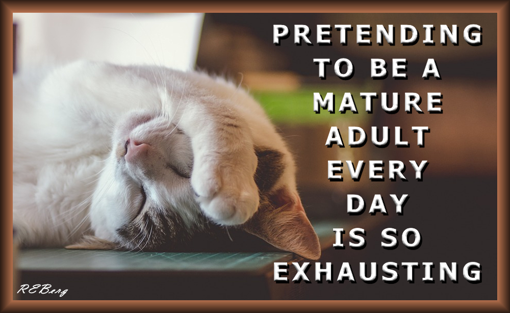 Daunting Adulthood Image June 12, 2023 R.E. Berg Age Management, Companion Critters, humor, joke, meme, Random Observations adult, cat, daily, exhausting, mature, pretense