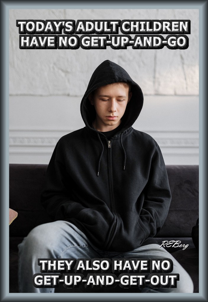 Permanent Residents Image November 22, 2023 R.E. Berg Age Management, humor, Improper Parenting, joke, meme, Mental Gymnastics, Occupational Oddities, Punishingly Punny Too, Social Hostility adult, children, get-up-and-get-out, get-up-and-go, lacking, slackers, today