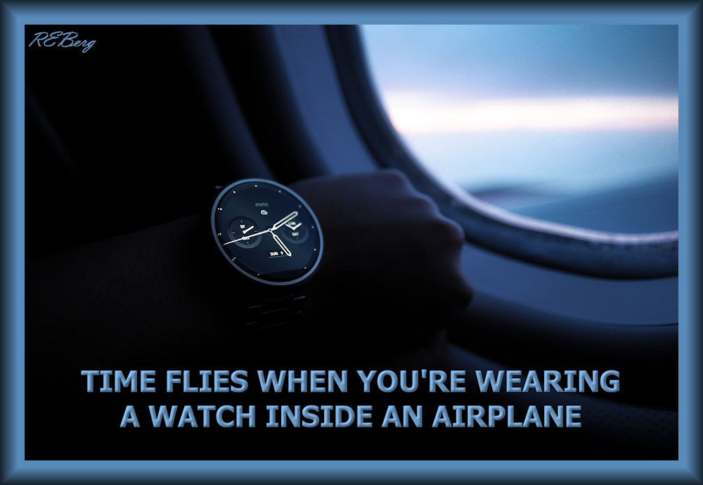 Time’s Up Image December 30, 2023 R.E. Berg humor, joke, meme, Punishingly Punny Too, Random Observations, Travel Trauma airplane, flies, time, watch, wearing