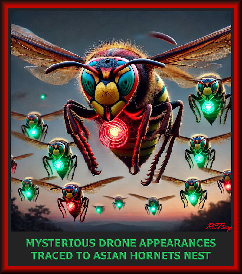 Stinging Discovery Image December 17, 2024 R.E. Berg Deadly Living, humor, Imaginary Reality, joke, Marginal Entertainment, meme, Punishingly Punny Too, Scientific Sensibility appearances, drones, hornets, mysterious, nest, traced