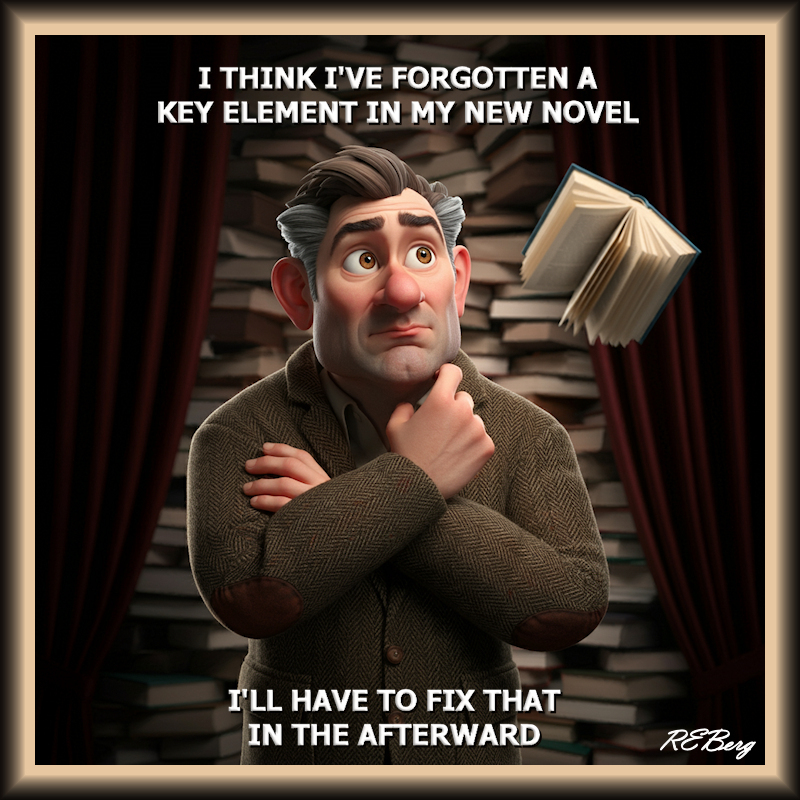 P.S. Image February 25, 2025 R.E. Berg humor, joke, Marginal Entertainment, meme, Occupational Oddities, Ready Reading afterward, afterword, author, books, fix, forgetful, key element, novel, writer