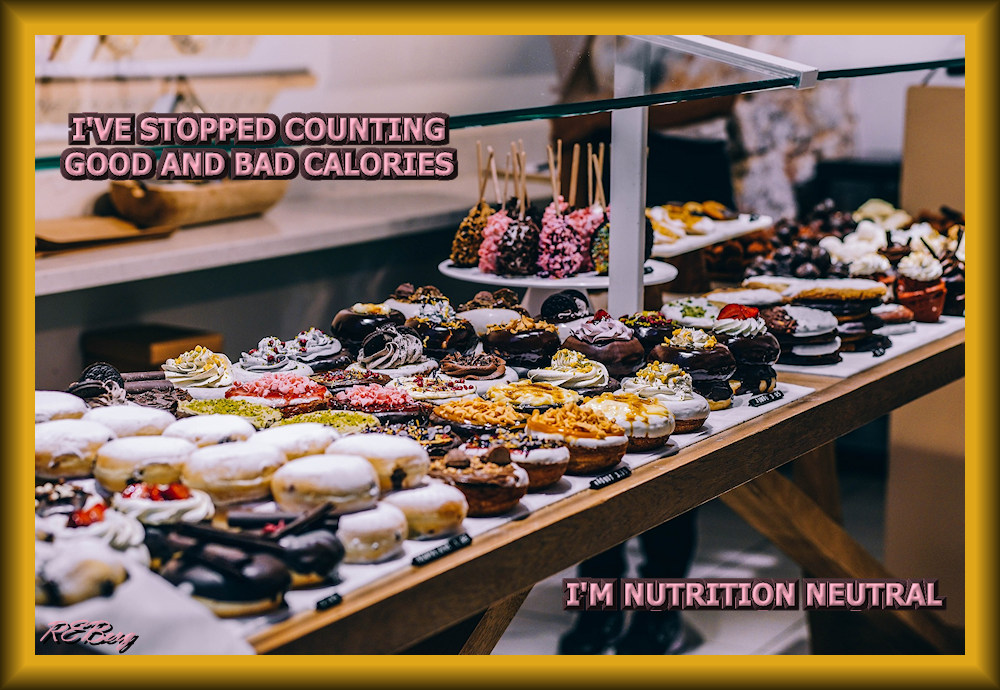 Scorefree Scarfing Image November 29, 2023 R.E. Berg Culinary Curiosities, Fantasy Fitness, humor, joke, meme, Mental Gymnastics bad, calories, counting, good, neutral, nutrition, stopped