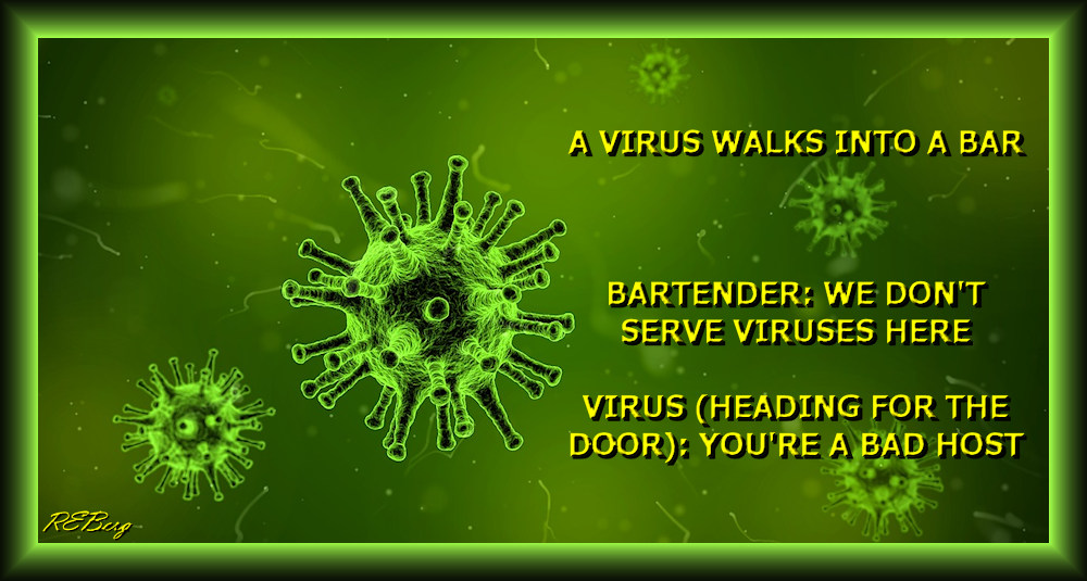 Going Viral Image November 15, 2023November 15, 2023 R.E. Berg humor, Imaginary Reality, joke, meme, Punishingly Punny, Scientific Sensibility, Social Hostility bad, bar, bartender, door, host, serve, virus, walks