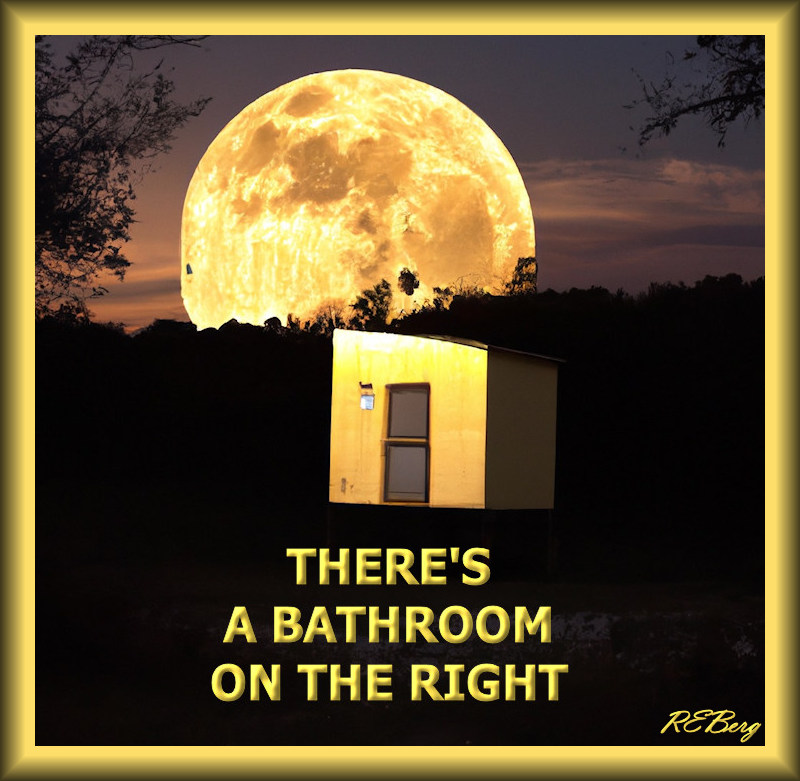 Lunar Premonition Image December 9, 2023 R.E. Berg humor, joke, meme, Musical Mayhem, Punishingly Punny bad, CCR, moon, outhouse, rising