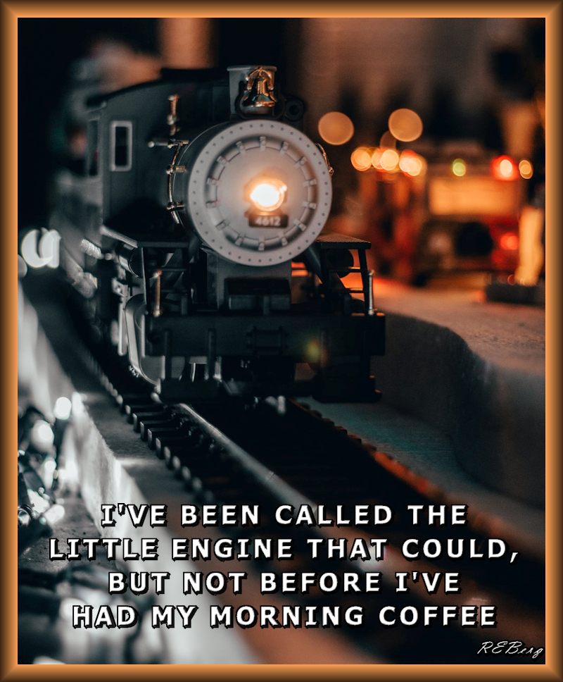 Stoking Up Image May 5, 2023 R.E. Berg Culinary Curiosities, humor, joke, meme caffeine, coffee, engine, little, locomotive, morning, power