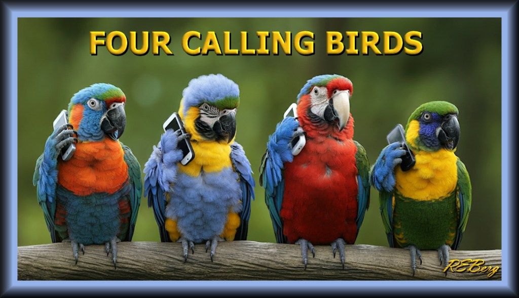 Holiday Twitter Image December 19, 2024 R.E. Berg Companion Critters, humor, joke, Marginal Entertainment, meme, Musical Mayhem, Special Days birds, branch, calling, cell phones, four, parrots
