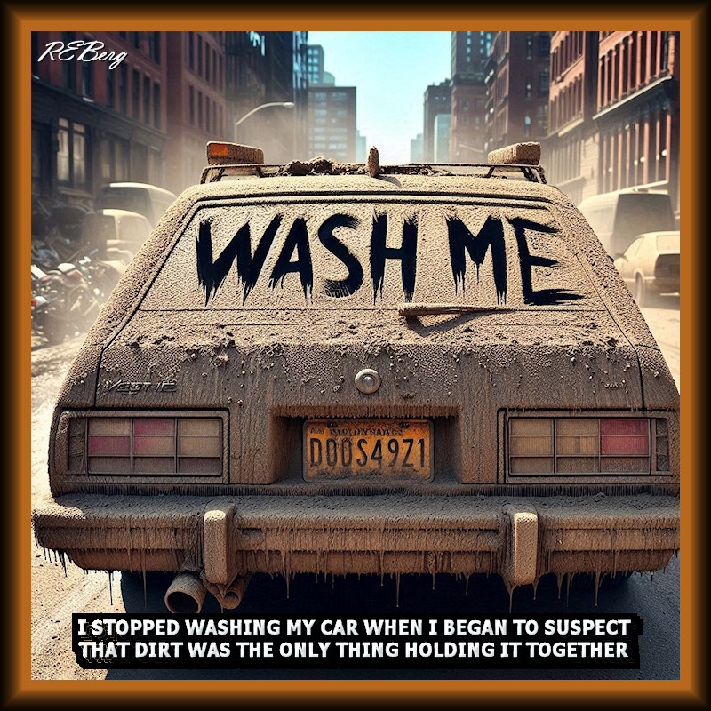Dark Matter Image June 5, 2024 R.E. Berg humor, Imaginary Reality, joke, meme, Random Observations, Travel Trauma began, car, dirt, holding, stopped, suspect, together, washing