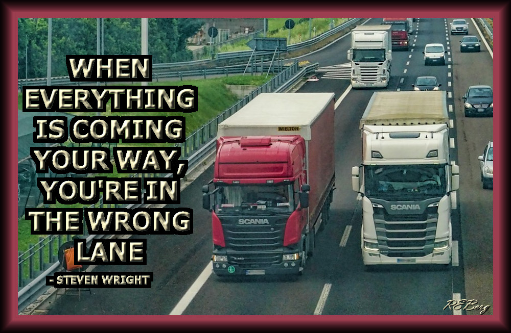 Helpful Hint Image March 17, 2023 R.E. Berg Deadly Living, humor, joke, meme, Quote Quotient, Random Observations, Travel Trauma cars, coming, everything, freeway, highway, lane, oncoming, road, semis, Steven Wright, traffic, trucks, way, wrong, your