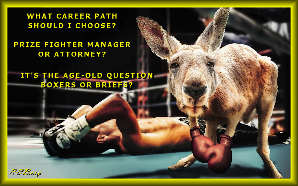 Split Decision Image November 30, 2023 R.E. Berg Fabulous Fashion, humor, joke, meme, Occupational Oddities, Punishingly Punny Too age-old question, attorney, boxers, briefs, career, choice, prize fight manager