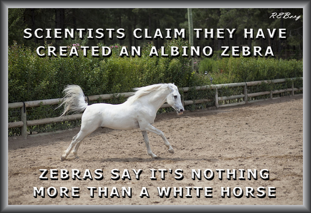 Equine Enigma Image December 31, 2023 R.E. Berg Companion Critters, humor, joke, meme, Mental Gymnastics albino zebra, claim, scientists, white horse