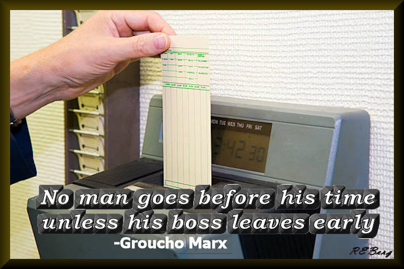 Early Out Image March 9, 2023 R.E. Berg humor, joke, meme, Occupational Oddities, Quote Quotient, That's Living before, boss, clock, early, goes, Groucho Marx, leaves, man, out, punching, time, work